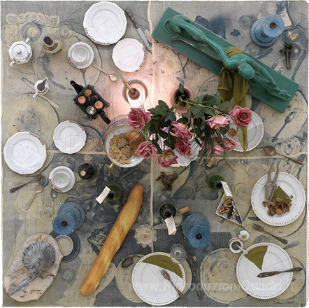 Ti offriamo una riproduzione artigianale su tela dell'opera famosa 'Henkel Bankett' di Daniel Spoerri, dal Museo delle Riproduzioni.