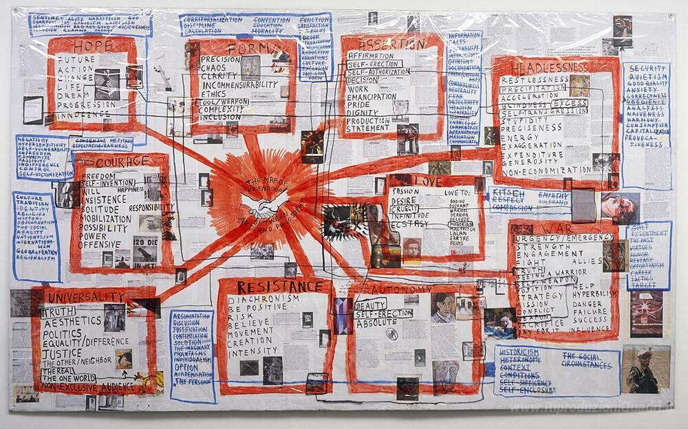 Ti offriamo una riproduzione artigianale su tela dell'opera famosa 'La Mappa di amicizia tra arte e filosofia' di Thomas Hirschhorn, dal Museo delle Riproduzioni.