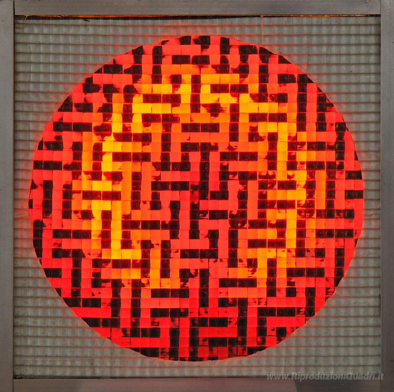 Ti offriamo una riproduzione artigianale su tela dell'opera famosa 'Schema luminoso variabile + Quadrionda 130' di Grazia Varisco, dal Museo delle Riproduzioni.