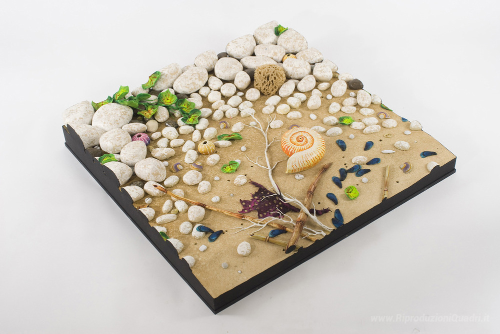 Ti offriamo una riproduzione artigianale su tela dell'opera famosa 'Spiaggia con Nautilus' di Piero Gilardi, dal Museo delle Riproduzioni.