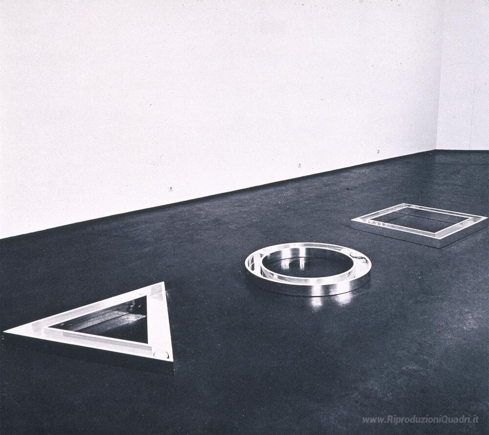 Ti offriamo una riproduzione artigianale su tela dell'opera famosa 'Triangolo, Cerchio, Quadrato' di Walter De Maria, dal Museo delle Riproduzioni.