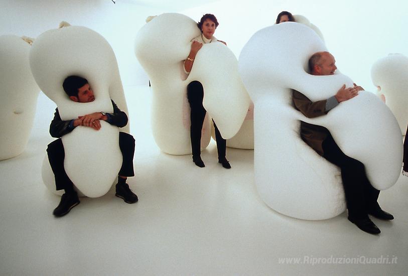 Ti offriamo una riproduzione artigianale su tela dell'opera famosa 'Umanoidi Famiglia' di Ernesto Neto, dal Museo delle Riproduzioni.