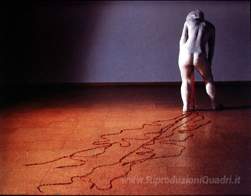 Ti offriamo una riproduzione artigianale su tela dell'opera famosa 'Untitled (Corpo Trailing Sangue)' di Kiki Smith, dal Museo delle Riproduzioni.