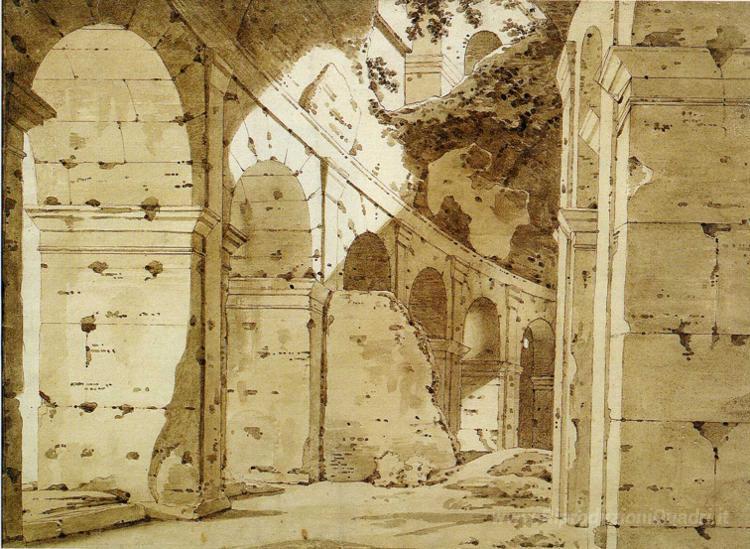 Ti offriamo una riproduzione artigianale su tela dell'opera famosa 'All'interno della Galleria del Colosseo' di Joseph Wright, dal Museo delle Riproduzioni.