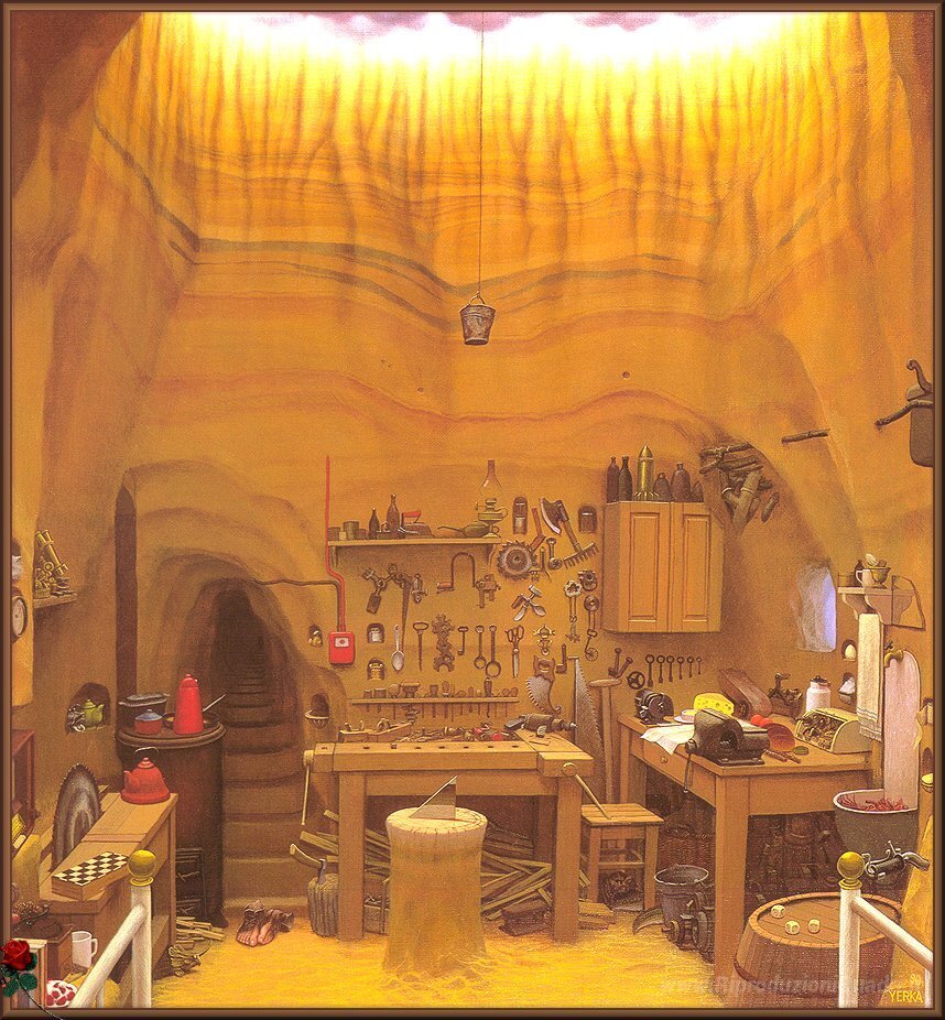 Ti offriamo una riproduzione artigianale su tela dell'opera famosa 'Beneath The Dunes' di Jacek Yerka, dal Museo delle Riproduzioni.