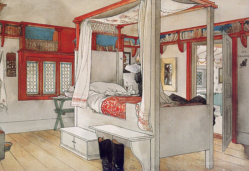 Ti offriamo una riproduzione artigianale su tela dell'opera famosa 'Camera di papà' di Carl Larsson, dal Museo delle Riproduzioni.