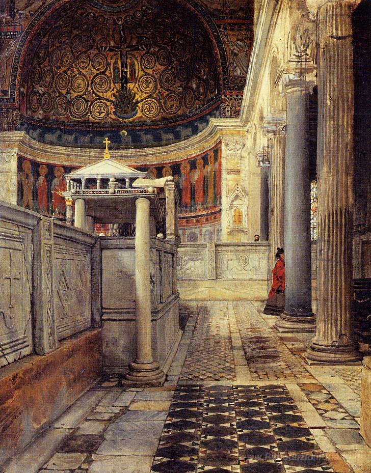 Ti offriamo una riproduzione artigianale su tela dell'opera famosa 'Chiesa di San Clemente' di Sir Lawrence Alma-Tadema, dal Museo delle Riproduzioni.