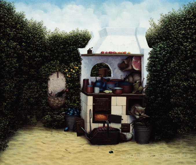 Ti offriamo una riproduzione artigianale su tela dell'opera famosa 'Cucina estiva' di Jacek Yerka, dal Museo delle Riproduzioni.