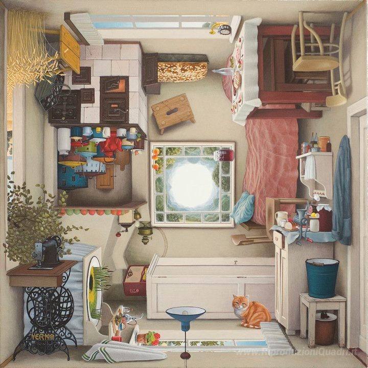 Ti offriamo una riproduzione artigianale su tela dell'opera famosa 'Cucina polacca' di Jacek Yerka, dal Museo delle Riproduzioni.