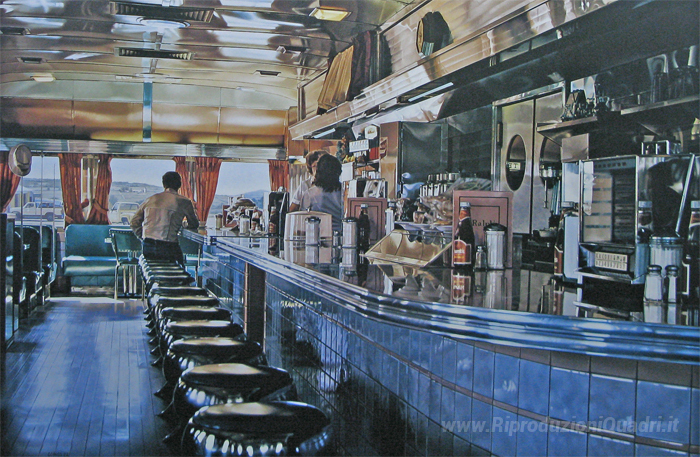 Ti offriamo una riproduzione artigianale su tela dell'opera famosa 'Diner di Ralph' di Ralph Goings, dal Museo delle Riproduzioni.