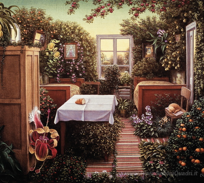 Ti offriamo una riproduzione artigianale su tela dell'opera famosa 'Festive Camera' di Jacek Yerka, dal Museo delle Riproduzioni.
