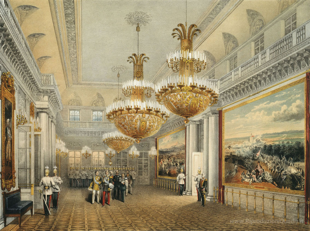 Ti offriamo una riproduzione artigianale su tela dell'opera famosa 'Hall Il Maresciallo del Palazzo d'Inverno' di Vasily Sadovnikov, dal Museo delle Riproduzioni.