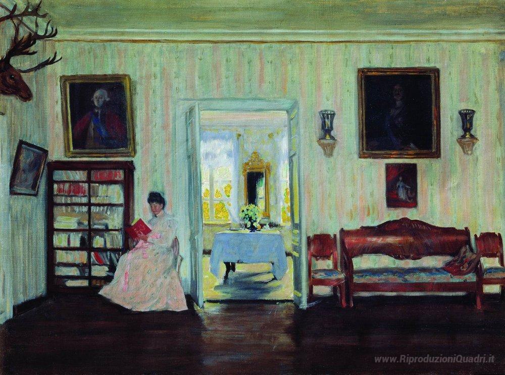 Scopri l'incanto del dipinto a olio House In Uspensky dell'artista russo Boris Kustodiev, una vera ode alla bellezza della vita quotidiana. Kustodiev, noto per la sua maestria nell'uso del colore e della luce, ha creato un'opera che cattura l'essenza di un paesaggio suggestivo e accogliente, trasportandoci in un'atmosfera di serenità e calore.