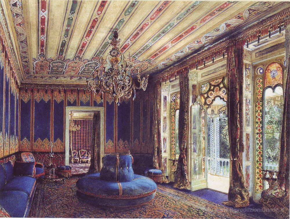 Ti offriamo una riproduzione artigianale su tela dell'opera famosa 'Il Salone turco, Villa Hügel, Hietzing, Vienna' di Rudolf von Alt, dal Museo delle Riproduzioni.