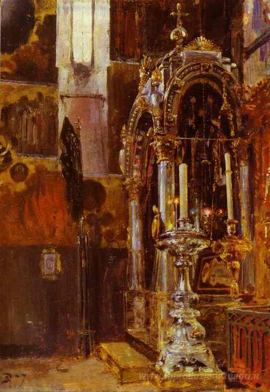 Ti offriamo una riproduzione artigianale su tela dell'opera famosa 'Il Santuario del Metropolitan Iona nella Cattedrale Uspensky' di Vasily Polenov, dal Museo delle Riproduzioni.