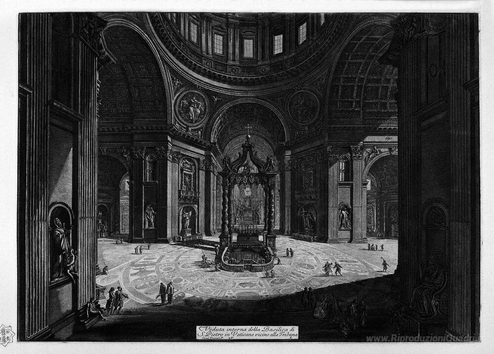Ti offriamo una riproduzione artigianale su tela dell'opera famosa 'Interno della Basilica di San Pietro in Vaticano' di Giovanni Battista Piranesi, dal Museo delle Riproduzioni.