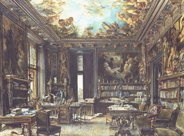 Ti offriamo una riproduzione artigianale su tela dell'opera famosa 'La biblioteca nel Palais Dumba' di Rudolf von Alt, dal Museo delle Riproduzioni.