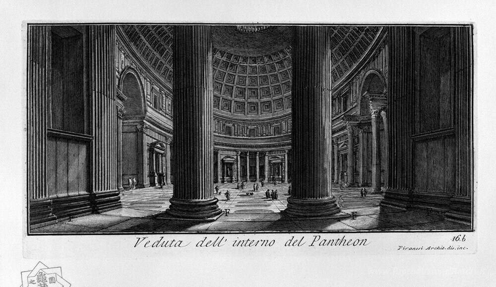 Ti offriamo una riproduzione artigianale su tela dell'opera famosa 'Le antichità romane, t. 1, Piatto XV. Pantheon.' di Giovanni Battista Piranesi, dal Museo delle Riproduzioni.