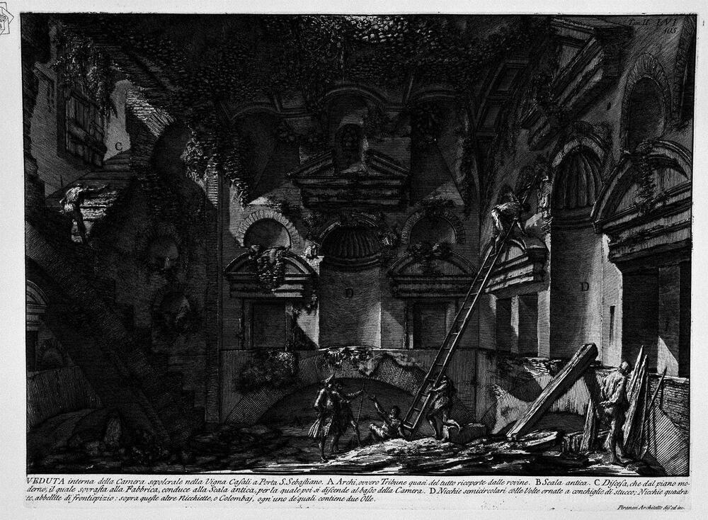 Ti offriamo una riproduzione artigianale su tela dell'opera famosa 'Le antichità romane, t. 2, Piatto LVI. Vista interna della camer' di Giovanni Battista Piranesi, dal Museo delle Riproduzioni.