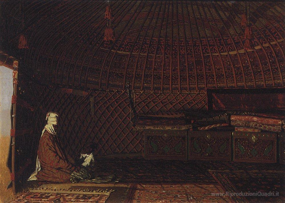 Ti offriamo una riproduzione artigianale su tela dell'opera famosa 'L'interno della yurta di ricchi kirghiso' di Vasily Vereshchagin, dal Museo delle Riproduzioni.