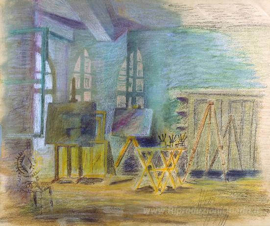 Ti offriamo una riproduzione artigianale su tela dell'opera famosa 'Lo Studio a Hydra' di Nikos Hadjikyriakos-Ghikas, dal Museo delle Riproduzioni.