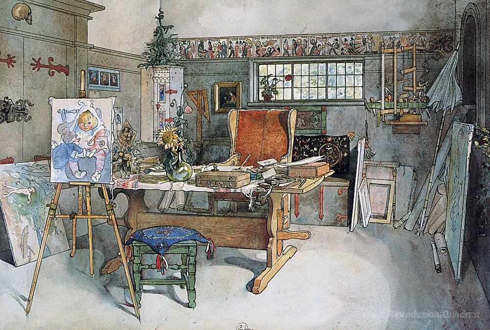 Ti offriamo una riproduzione artigianale su tela dell'opera famosa 'Lo Studio' di Carl Larsson, dal Museo delle Riproduzioni.