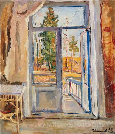 Ti offriamo una riproduzione artigianale su tela dell'opera famosa 'Molla. Porta aperta sul balcone.' di Pyotr Konchalovsky, dal Museo delle Riproduzioni.