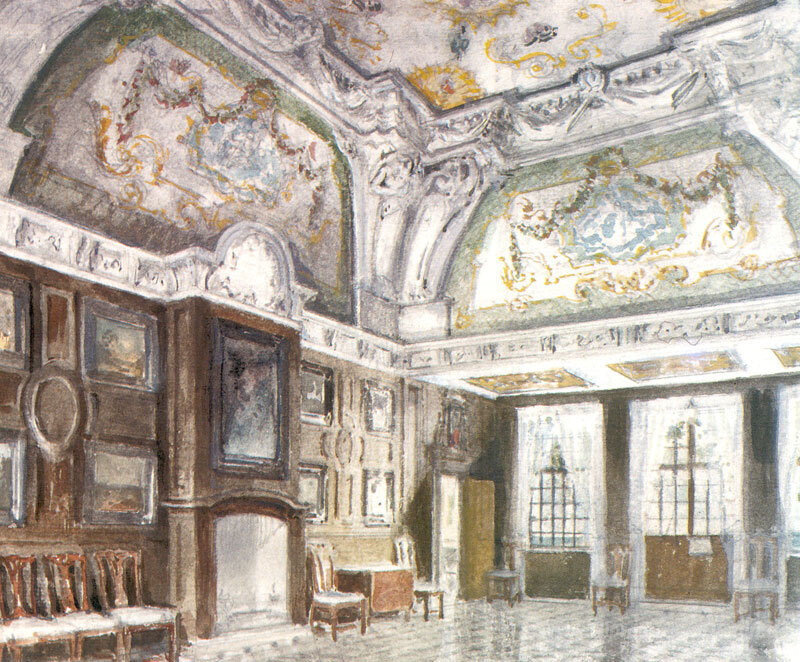 Ti offriamo una riproduzione artigianale su tela dell'opera famosa 'Peterhof Palace. Mon Plaisir. Stanza di medie.' di Alexandre Benois, dal Museo delle Riproduzioni.