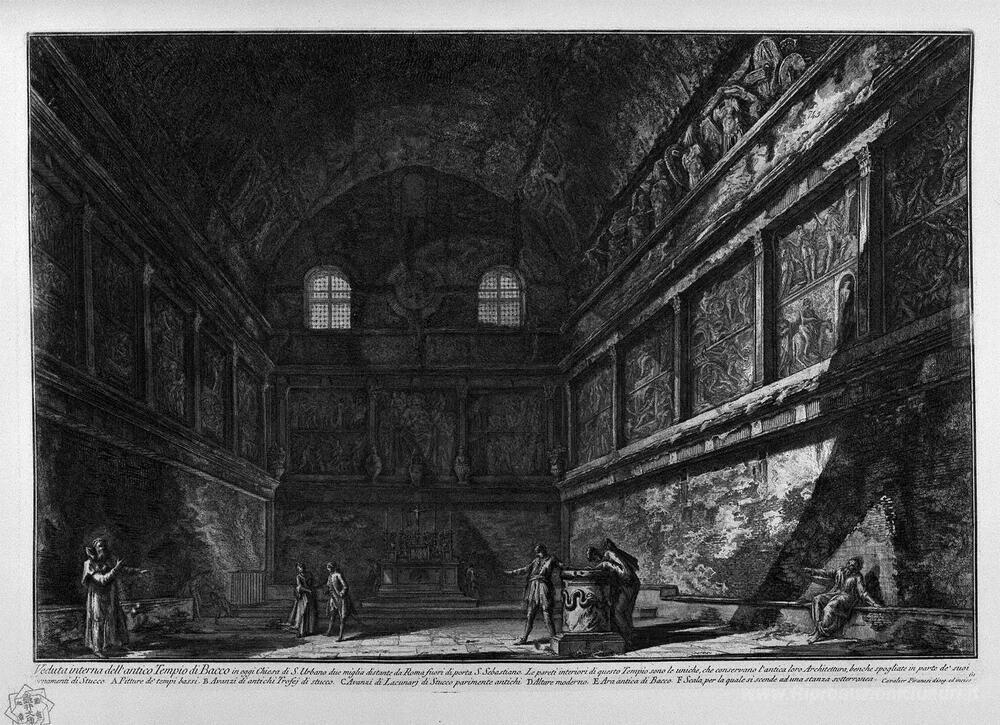 Ti offriamo una riproduzione artigianale su tela dell'opera famosa 'Veduta del Tempio di Bacco, oggi nella chiesa di San urbano' di Giovanni Battista Piranesi, dal Museo delle Riproduzioni.