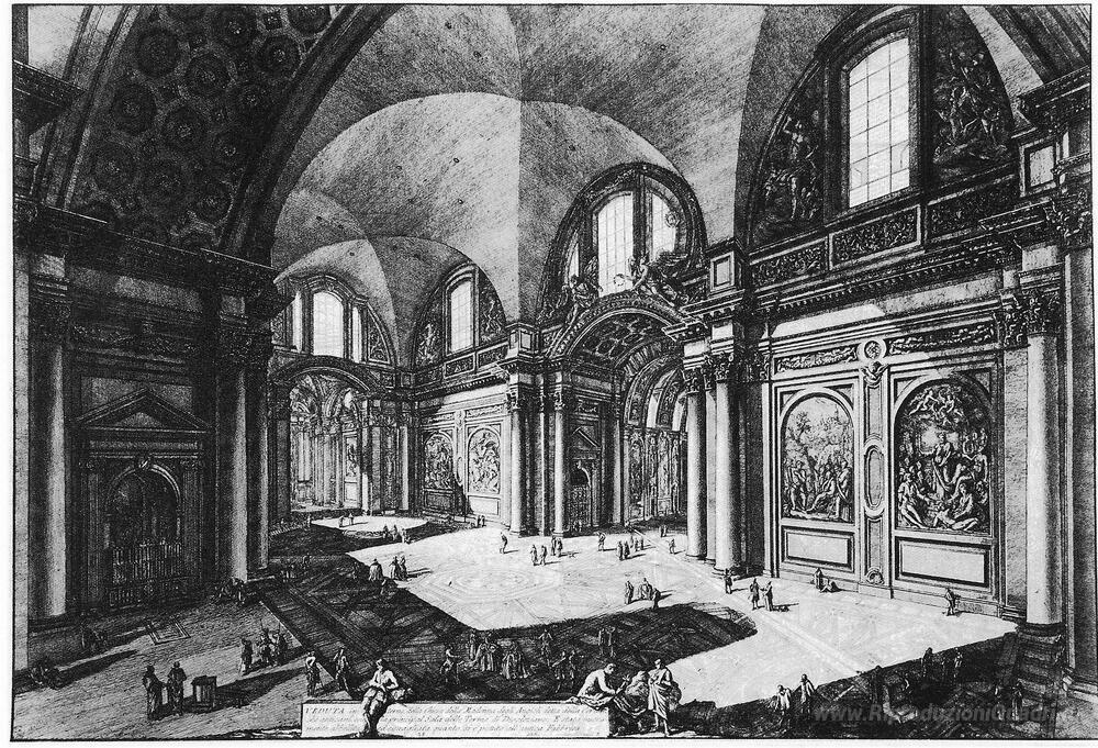 Ti offriamo una riproduzione artigianale su tela dell'opera famosa 'Vedute di Roma' di Giovanni Battista Piranesi, dal Museo delle Riproduzioni.