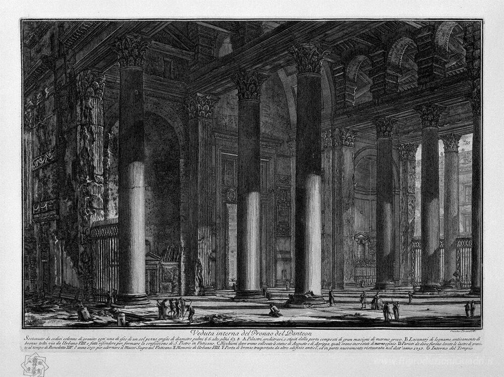 Ti offriamo una riproduzione artigianale su tela dell'opera famosa 'Vista interna del pronao del Pantheon' di Giovanni Battista Piranesi, dal Museo delle Riproduzioni.