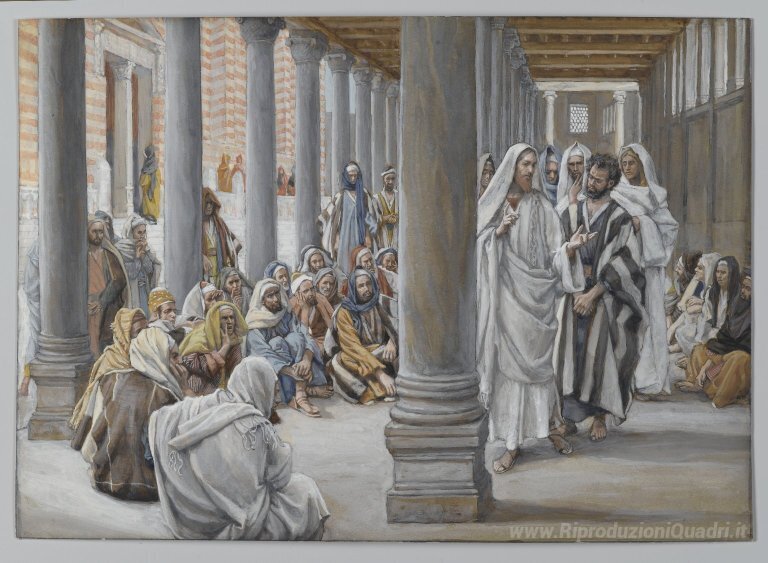 Ti offriamo una riproduzione artigianale su tela dell'opera famosa 'Gesù cammina nel portico di Salomone (Jésus se promène dans le p' di James Tissot, dal Museo delle Riproduzioni.