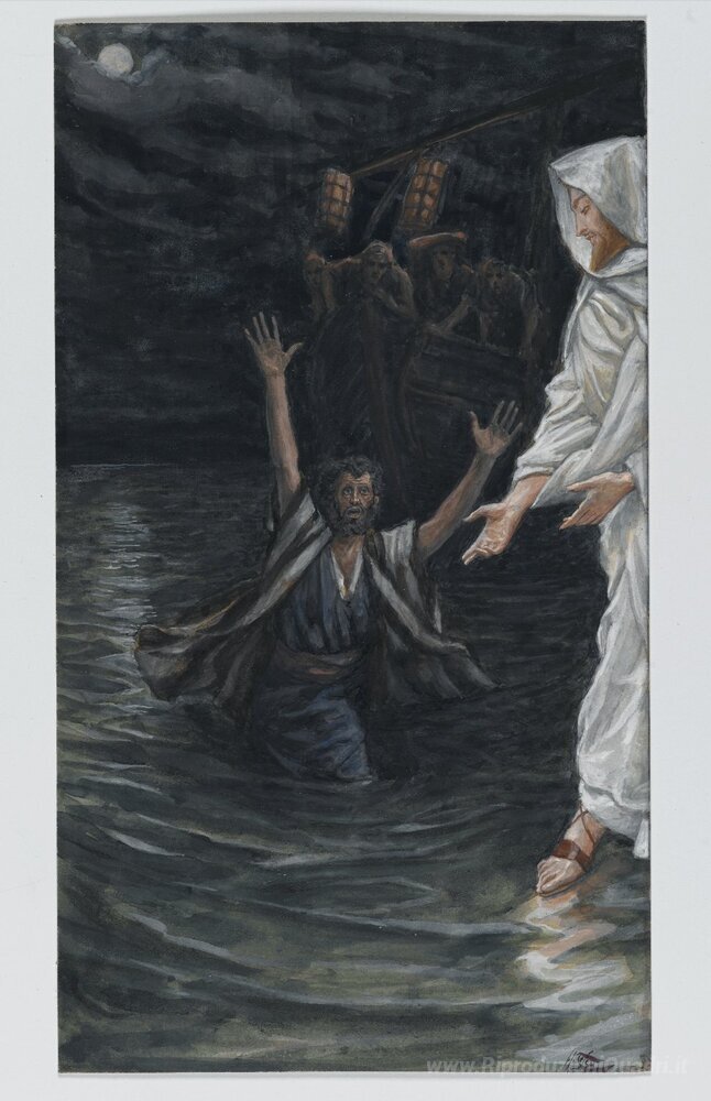 Ti offriamo una riproduzione artigianale su tela dell'opera famosa 'San Pietro cammina sulle acque (Saint Pierre marche sur la mer)' di James Tissot, dal Museo delle Riproduzioni.