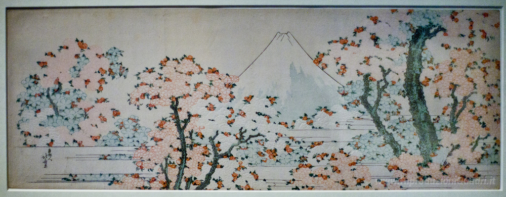 Ti offriamo una riproduzione artigianale su tela dell'opera famosa 'Vista sul Monte Fuji tra gli alberi flowerin' di Katsushika Hokusai, dal Museo delle Riproduzioni.