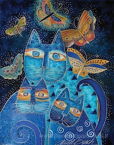 Ti offriamo una riproduzione artigianale su tela dell'opera famosa 'I gatti blu con farfalle' di Laurel Burch, dal Museo delle Riproduzioni.