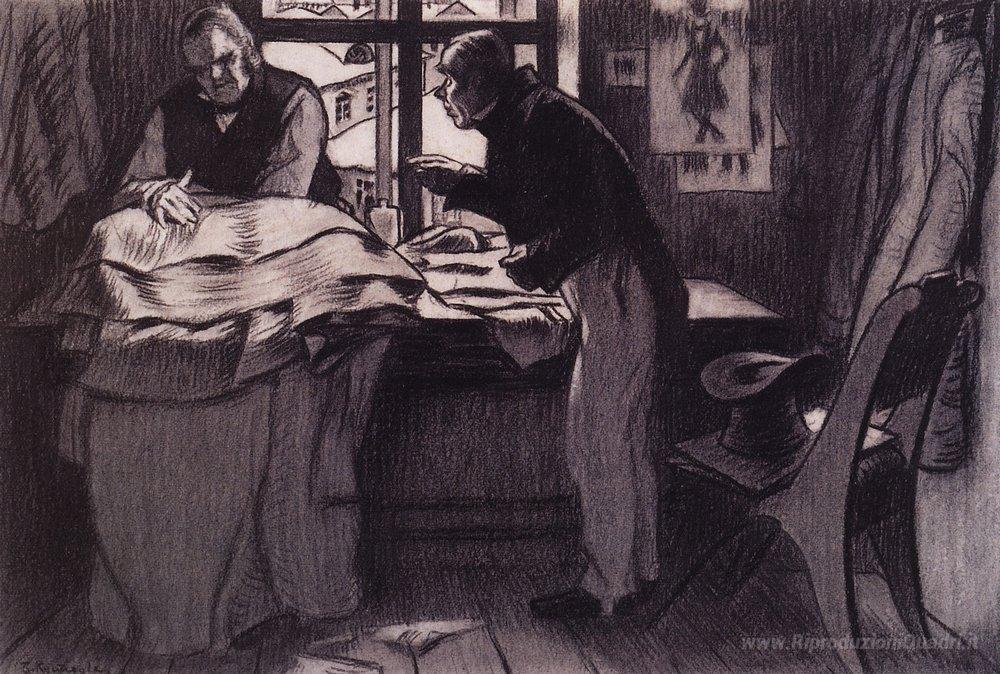Ti offriamo una riproduzione artigianale su tela dell'opera famosa 'Akakij Akakiyevich visita Petrovich' di Boris Kustodiev, dal Museo delle Riproduzioni.