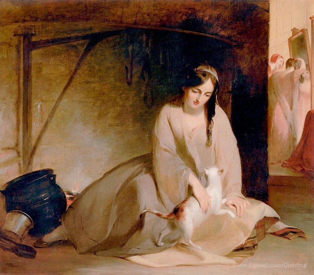 Ti offriamo una riproduzione artigianale su tela dell'opera famosa 'Cenerentola al fuoco della cucina' di Thomas Sully, dal Museo delle Riproduzioni.