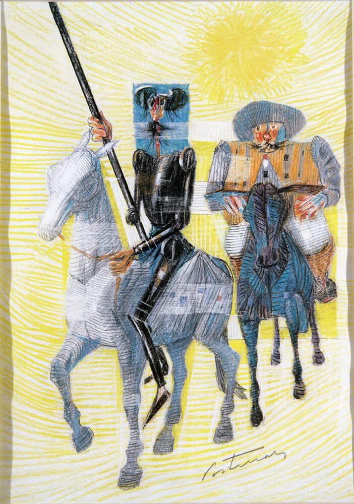 Ti offriamo una riproduzione artigianale su tela dell'opera famosa 'Dom Quixote e Sancho Panca Saindo para Suas Aventuras' di Candido Portinari, dal Museo delle Riproduzioni.