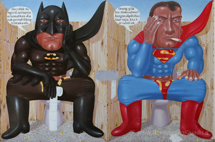 Ti offriamo una riproduzione artigianale su tela dell'opera famosa 'Eroe scusate ho dimenticato' di Nyoman Masriadi, dal Museo delle Riproduzioni.
