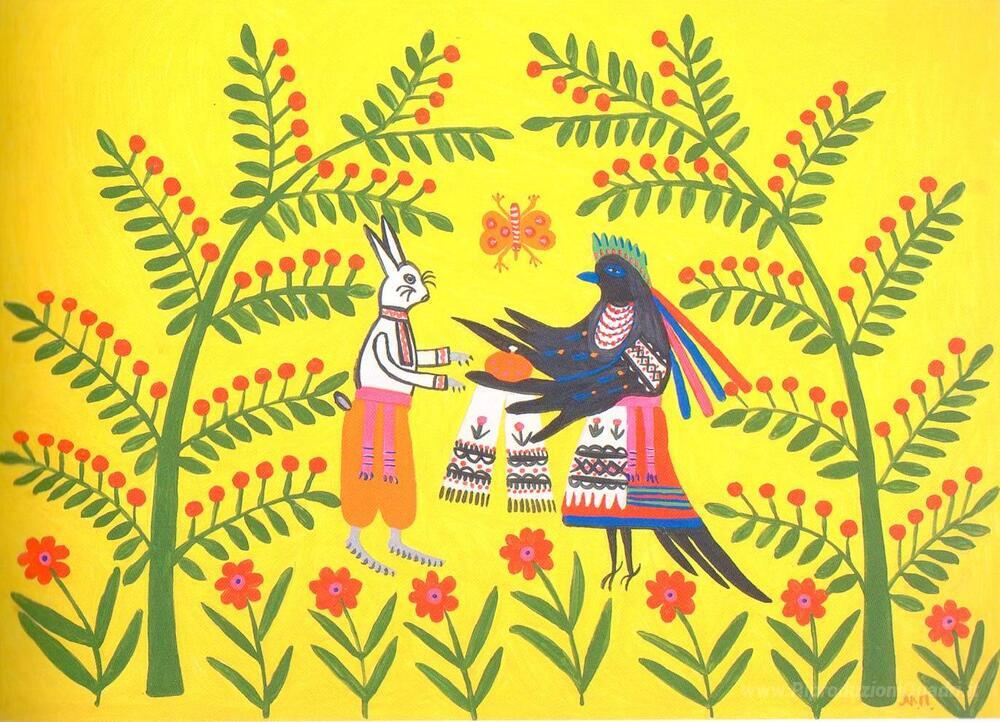 Ti offriamo una riproduzione artigianale su tela dell'opera famosa 'Festa di compleanno di una lepre' di Maria Primachenko, dal Museo delle Riproduzioni.
