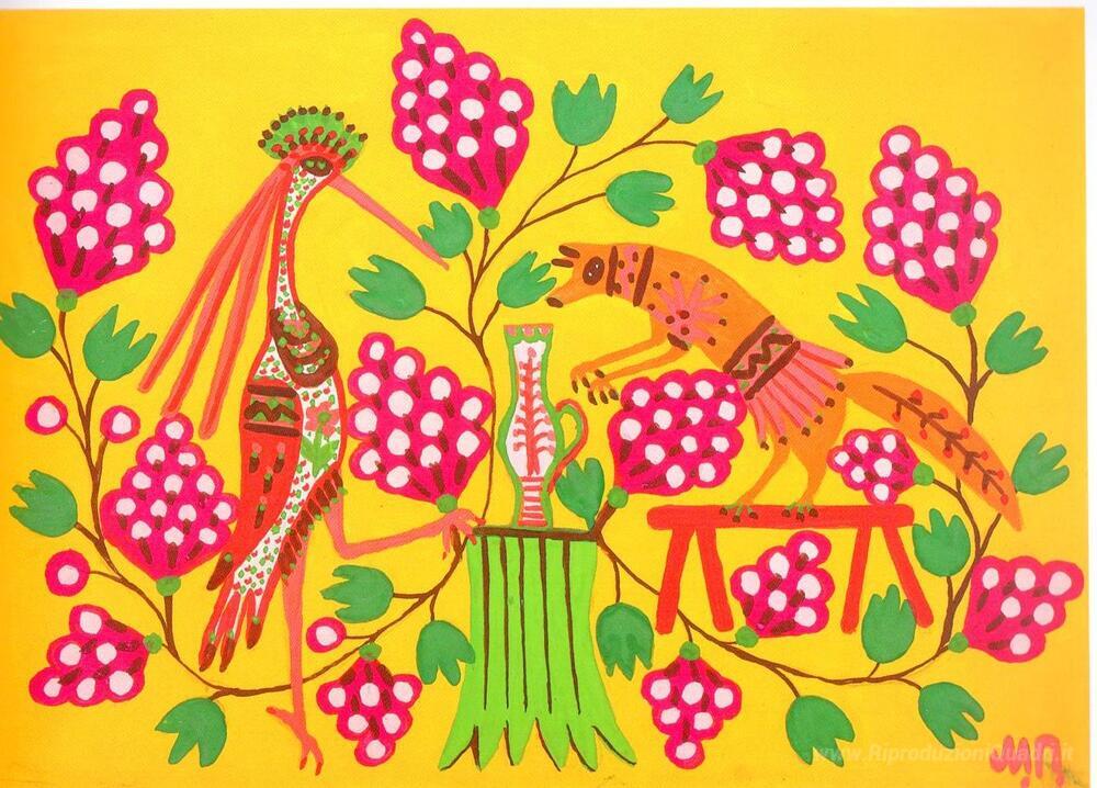 Ti offriamo una riproduzione artigianale su tela dell'opera famosa 'Gru fa amicizia con una volpe' di Maria Primachenko, dal Museo delle Riproduzioni.