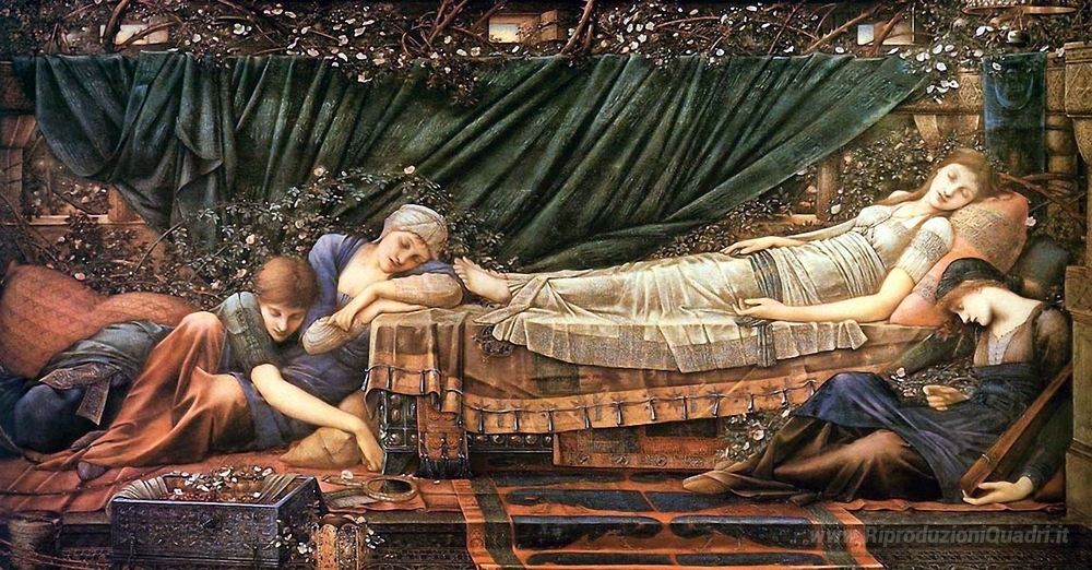 Ti offriamo una riproduzione artigianale su tela dell'opera famosa 'Il sleaping bellezza' di Edward Burne-Jones, dal Museo delle Riproduzioni.