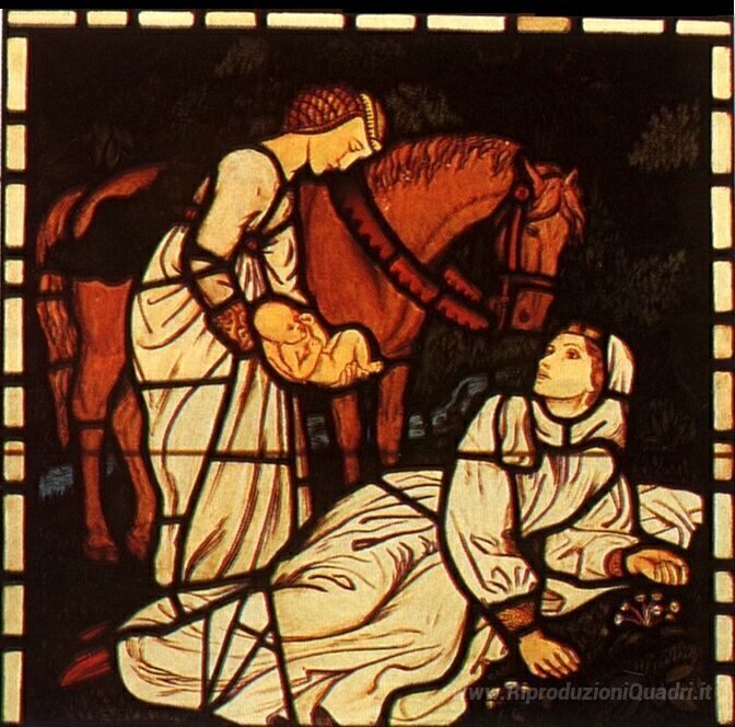 Ti offriamo una riproduzione artigianale su tela dell'opera famosa 'La nascita di Tristano, da 'La storia di Tristano e Isotta'' di Arthur Hughes, dal Museo delle Riproduzioni.