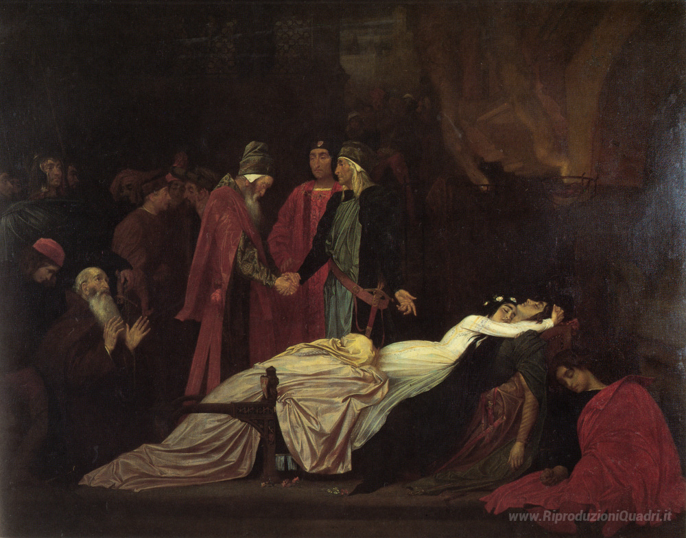 Ti offriamo una riproduzione artigianale su tela dell'opera famosa 'La riconciliazione dei Montecchi e Capuleti' di Frederic Leighton, dal Museo delle Riproduzioni.