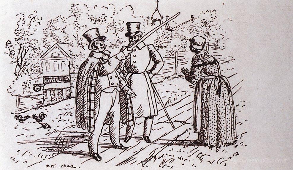 Ti offriamo una riproduzione artigianale su tela dell'opera famosa 'Parlando sulla strada (signori in strada al di fuori della casa ' di Boris Kustodiev, dal Museo delle Riproduzioni.