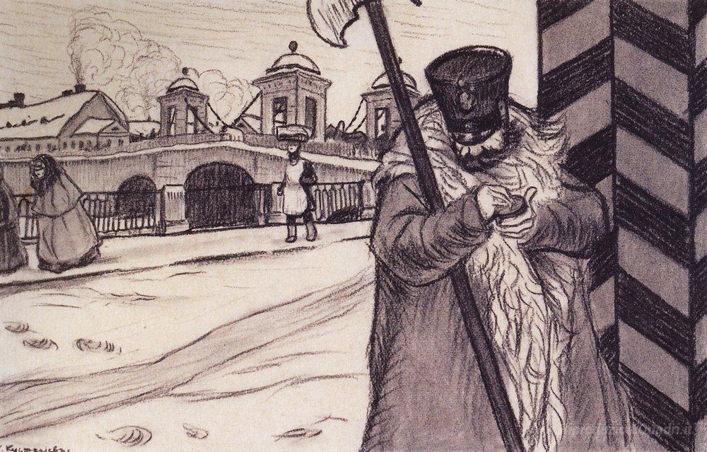Ti offriamo una riproduzione artigianale su tela dell'opera famosa 'Poliziotto' di Boris Kustodiev, dal Museo delle Riproduzioni.