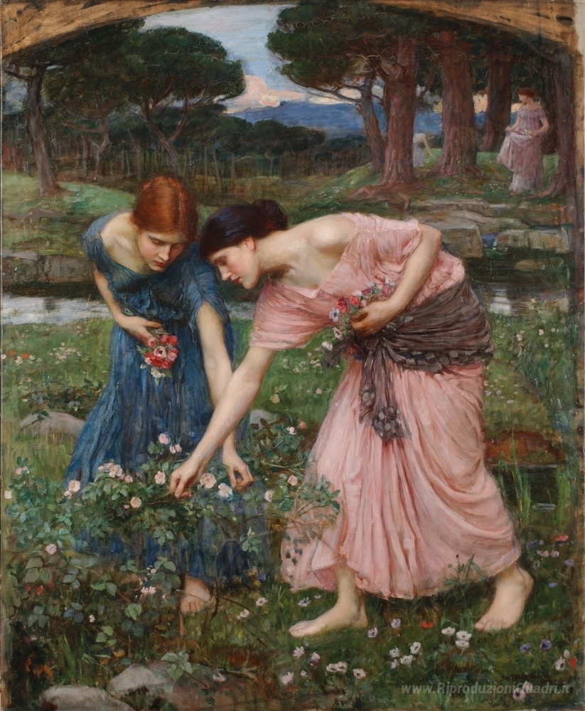 Ti offriamo una riproduzione artigianale su tela dell'opera famosa 'Raccogliere Ye Rosebuds Mentre Ye maggio' di John William Waterhouse, dal Museo delle Riproduzioni.
