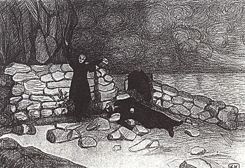 Ti offriamo una riproduzione artigianale su tela dell'opera famosa 'Una scena dal dramma di Leonid Andreev Anathema' di Kazimir Malevich, dal Museo delle Riproduzioni.