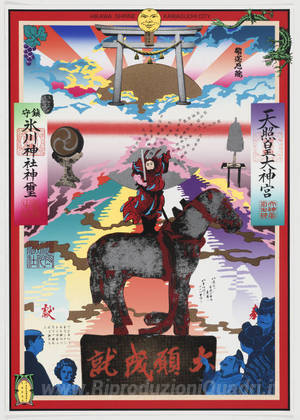 Ti offriamo una riproduzione artigianale su tela dell'opera famosa 'Hikawa Shrine' di Tadanori Yokoo, dal Museo delle Riproduzioni.