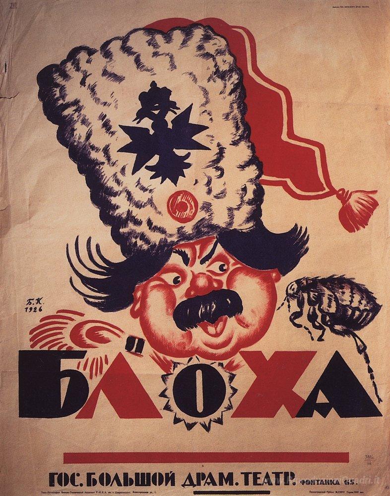 Ti offriamo una riproduzione artigianale su tela dell'opera famosa 'Locandina del gioco "Pulce"' di Boris Kustodiev, dal Museo delle Riproduzioni.